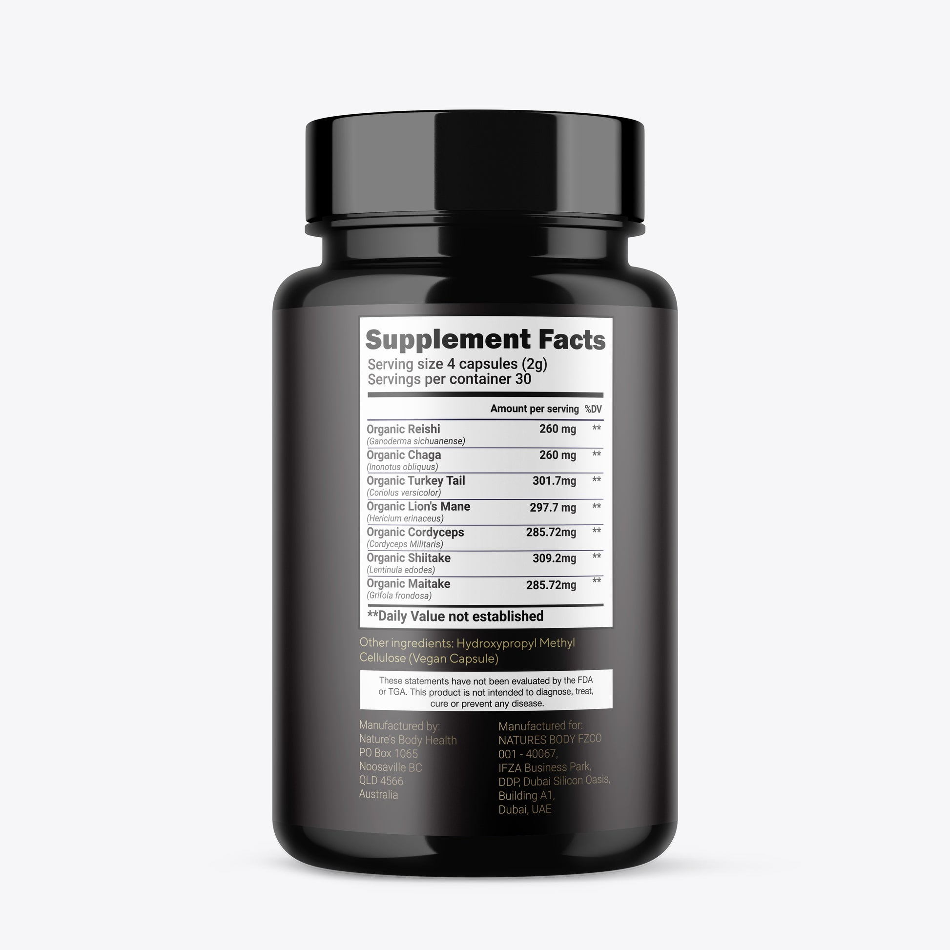Each Bottle of Nature's Body Immortal 7 Organic Mushroom Superfood Blend contains 120 Capsules (500mg each) of 7 of the most renowned superfood mushrooms. Made in Australia in a GMP certified factory.